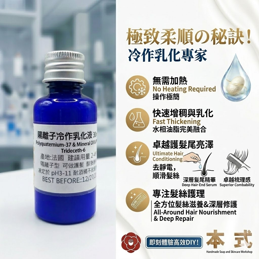 想要親手製作沙龍級的護髮產品,這款「陽離子冷作乳化劑」是您的核心首選。來自化妝品大國法國,這是一組經過預混合的高效陽離子增稠增效劑,專為「冷作法」設計,無需加熱即可與水分完美融合,瞬間轉化為質感豐潤、光澤亮麗的護髮乳霜。